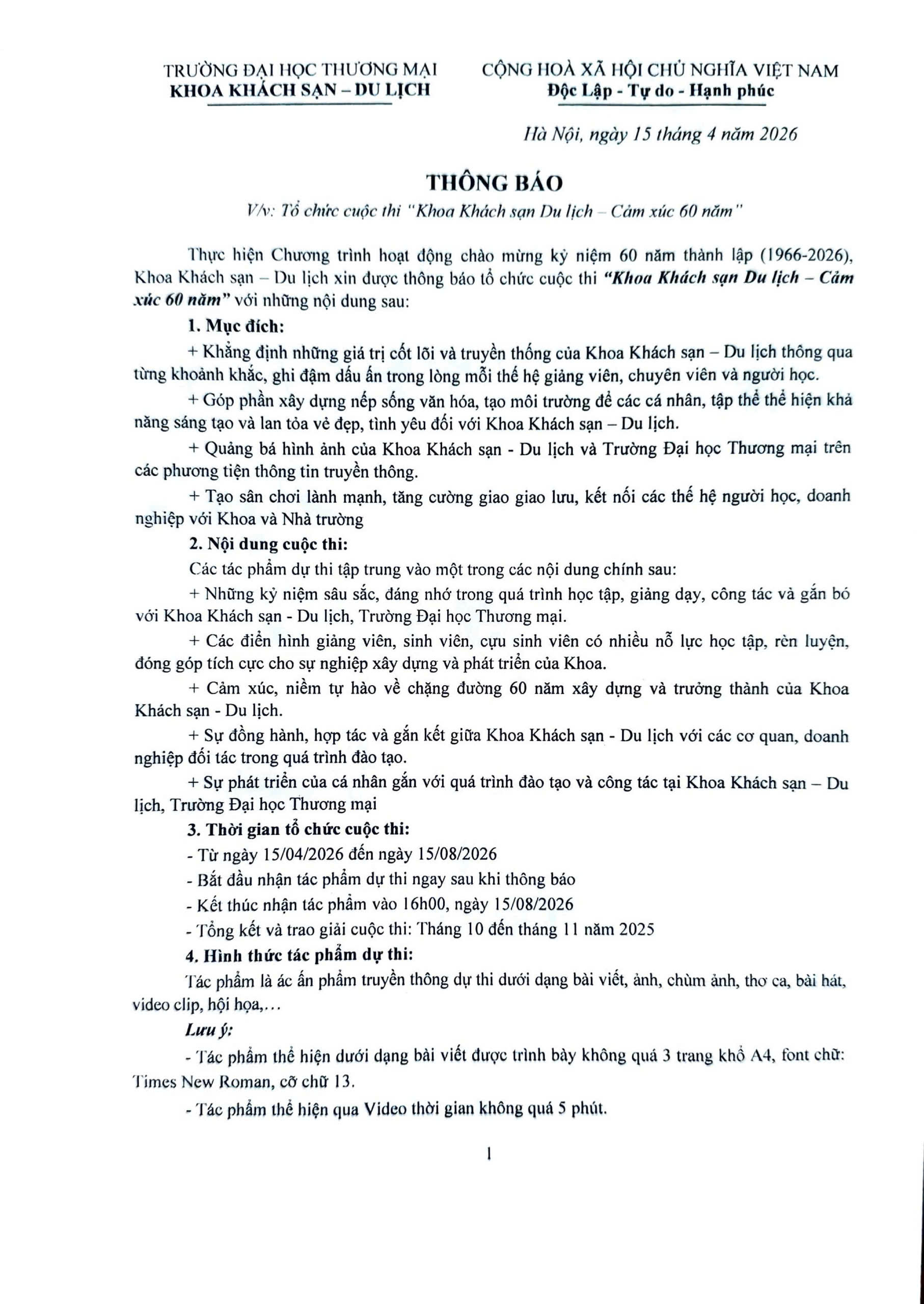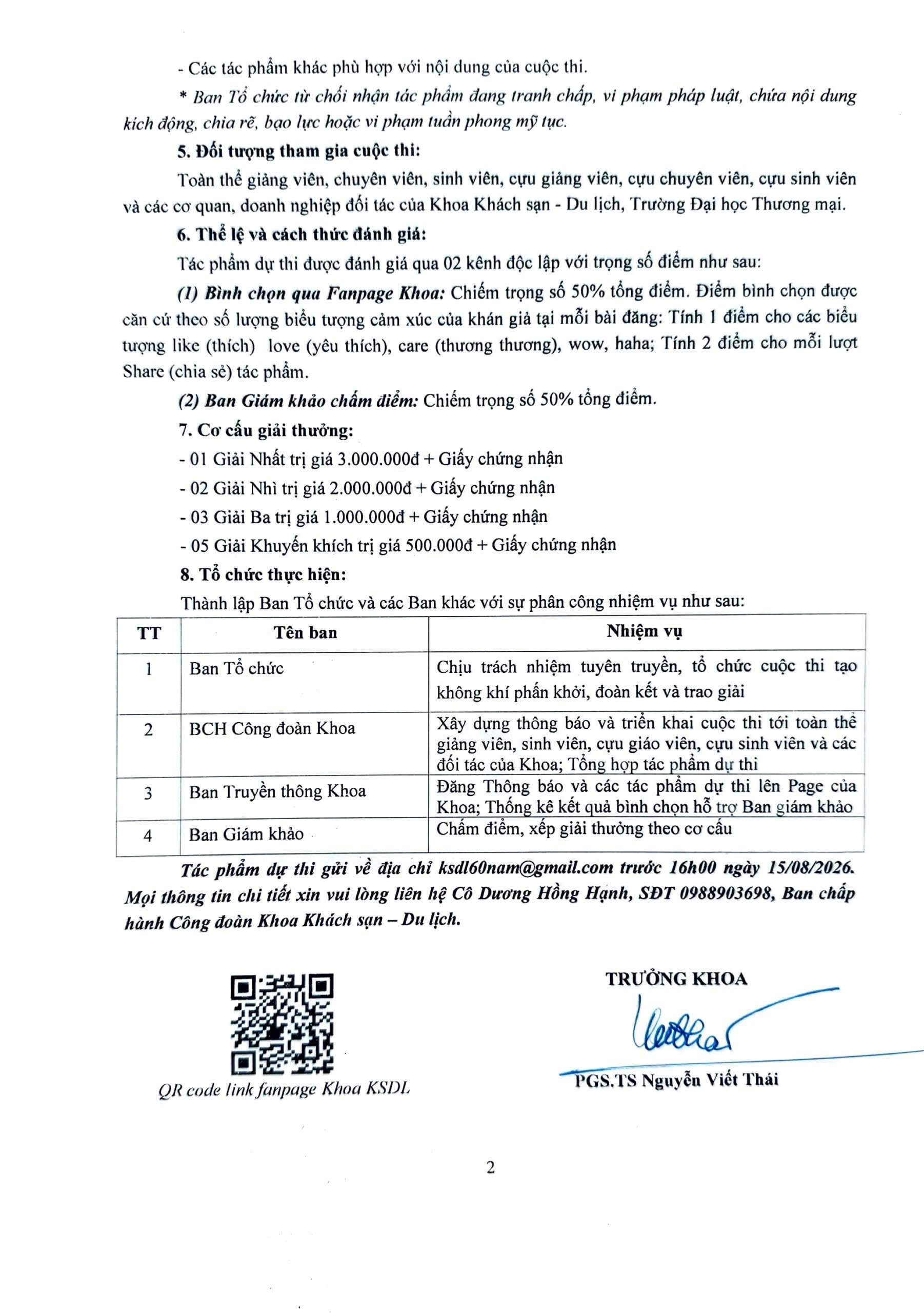 Tác phẩm dự thi gửi về địa chỉ ksdl60nam@gmail.com trước 16h00 ngày 15/08/2026. Mọi thông tin chi tiết xin vui lòng liên hệ Cô Dương Hồng Hạnh, SĐT 0988903698, Ban chấp hành Công đoàn Khoa Khách sạn – Du lịch.