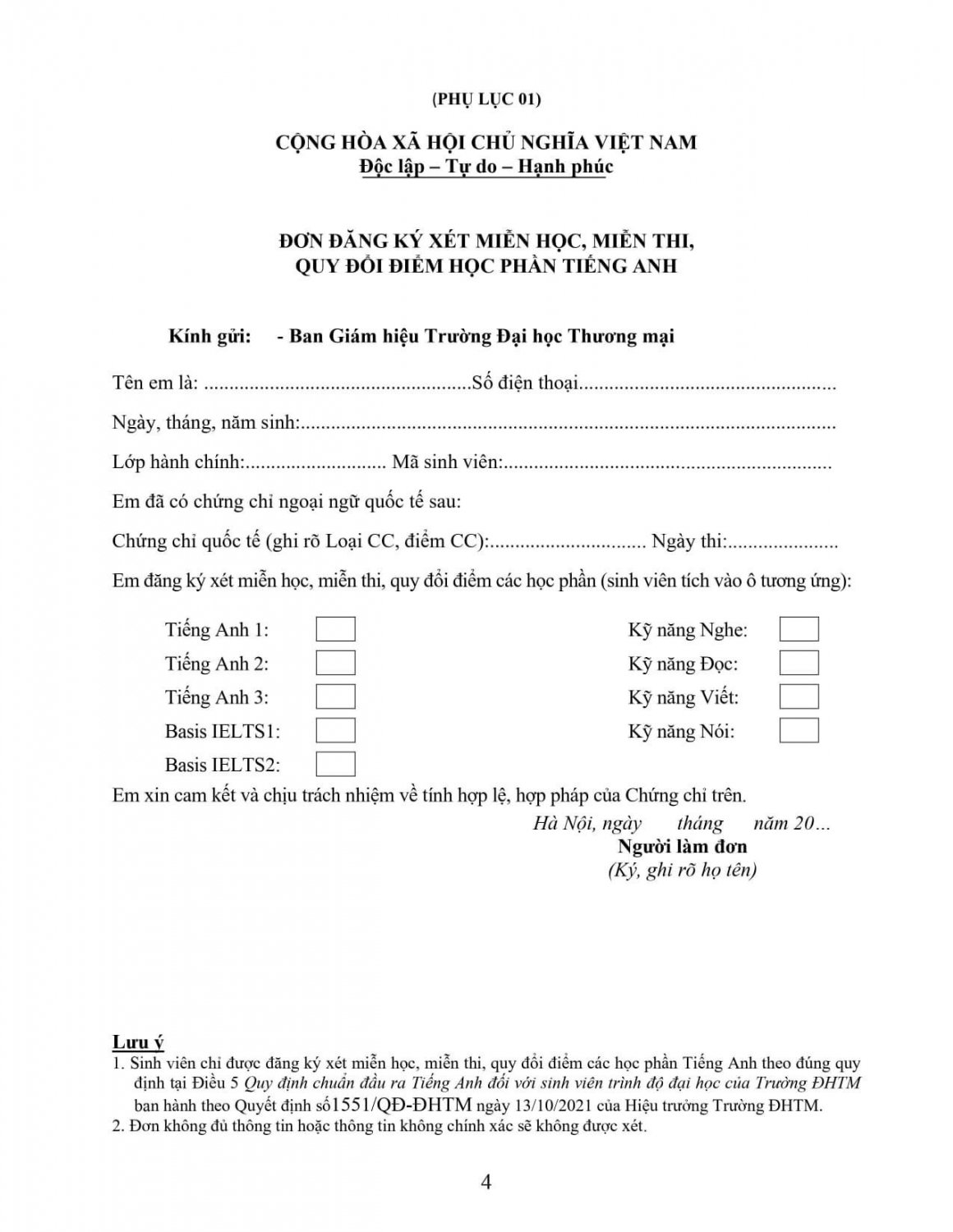 Thông báo quy định về việc xét miễn học, miễn thi, quy đổi điểm học phần tiếng Anh và miễn học học phần Tin học quản lý trong chương trình đào tạo đối với sinh viên trình độ đại học từ khóa tuyển sinh năm 2021, như sau: